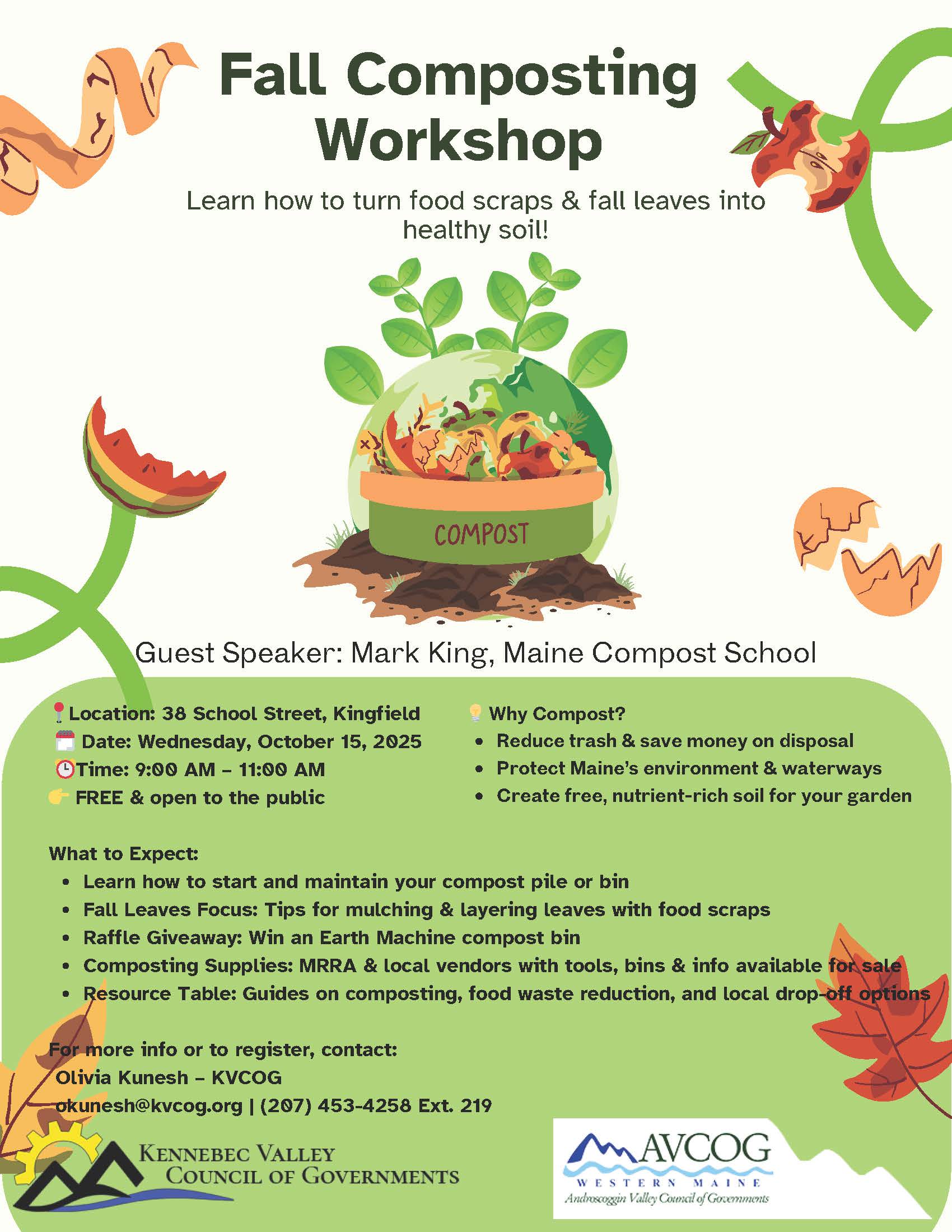 Fall Composting Workshop Wednesday, October 15th 9am – 11am @ 38 School St Kingfield Post published:September 25, 2025 Post category:Community / Kingfield/New Portland Transfer Station / Town Office Please Share This Share this content Opens in a new window Opens in a new window Opens in a new window Opens in a new window You Might Also Like The Town Office will be CLOSED in observance of Labor Day on Saturday, September 04th and Monday, September 6th. August 30, 2021 Request for Winter Sand Bids for the 2022-2023 winter season April 7, 2022 Community Dinner Sunday, December 3rd from 5-6 Free for New Portland Residents November 29, 2017