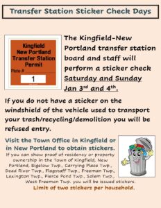 Kingfield-New Portland Transfer Station Sticker Policy Post published:December 29, 2025 Post category:Uncategorized Please Share This Share this content Opens in a new window Opens in a new window Opens in a new window Opens in a new window You Might Also Like 1st Selectmen’s Meeting in July is rescheduled for Tuesday, July 11th at 6:30pm June 27, 2023 Draft Agenda 6-17-2024 June 12, 2024 NEW PORTLAND & LEXINGTON TWP MEETING WITH MAINE D.O.T. July 25th at 5:30pm June 12, 2023